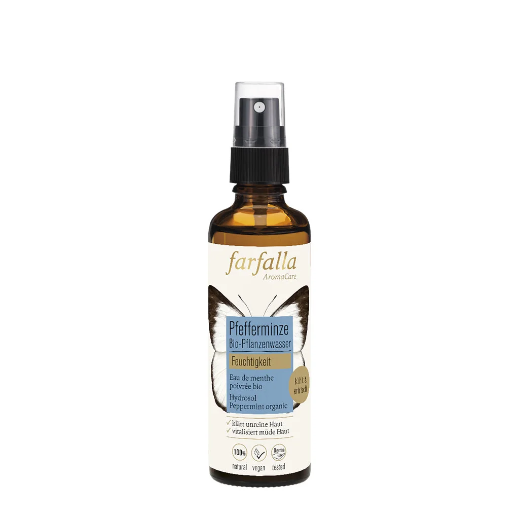 Das durch Wasserdampf-Destillation gewonnene Pflanzenwasser aus dem Kraut der Pfefferminze ist sehr beliebt zur Pflege aller Hauttypen, insbesondere auch von unreiner Haut. Pfefferminzhydrolat bringt dir einen echten Frischekick und regt Kreislauf und Konzentration an. Zudem hat es einen kühlenden Effekt – nicht nur im Sommer sondern auch bei Hitzewallungen und lindert Juckreiz nach lästigen Mückenstichen.